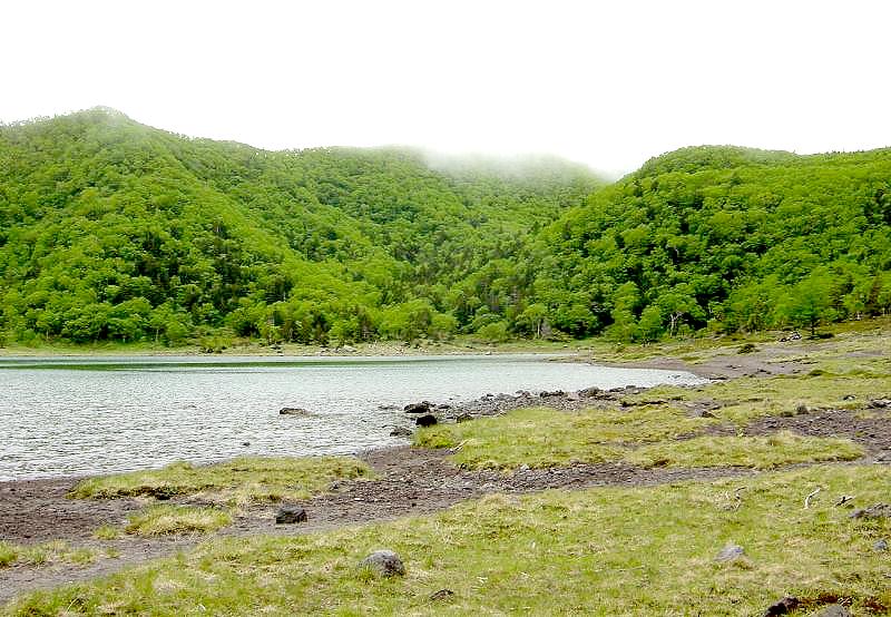 山頂から 避難小屋 に下る途中で,少しの間霧が晴れ, 五色沼 や 前白根山,男体山 や 中禅寺湖 が見えてきた。 男体山と中禅寺湖 ![]() 五色沼 避難小屋の南西にある 大凹地 も見えた。この大凹地は 特異な植生 を示しており, 植物学的に貴重な場所 なのだ。一般に,高度が高いほど気温は低くなるが,秋から冬にかけて,この大凹地では高度が低い凹地の底の方が周囲 より気温が低くなる現象が見られる。 冷えた空気がその重さで,凹地の底に溜まるからと言われる。奥白根山を 下り,避難小屋に着く前に,この 大凹地 を見に行った。山王峠の近くにある 涸沼 によく似た風景だった。