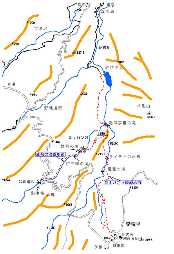 塩原へ下っていく道は,この後で,高巻をするため,斜面をジグザグに登っていく。その後はしばらくの間山腹を 緩やかに下っていいく。再び,急な斜面を少し下ると,そこは砂防ダムがあり,車の通れる道に出る。ここか ら塩原のビジターセンターまでは約1時間かかる。 分岐まで戻り, 雄飛の滝線歩道 を雄飛の滝に向かって進んだ。 高巻きから河原に降りる 木製階段
