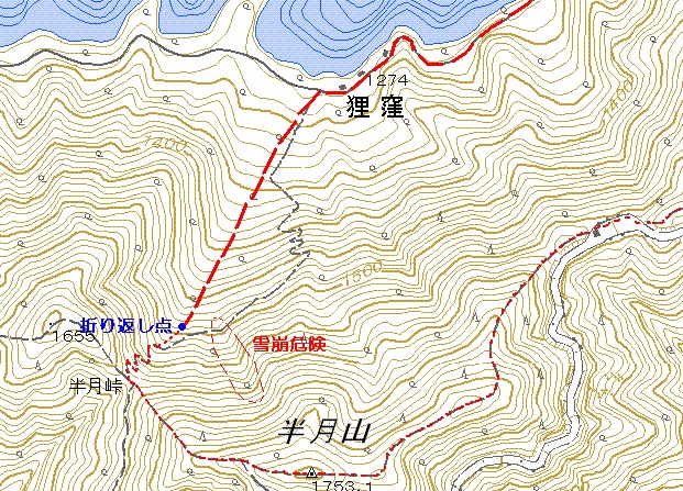 分岐からしばらくは夏道を登っていったが,途中から右にそれ,谷の方に向かって登っていった。地形図にはそれら しい表現はないが, 小さな起伏がたくさんある。 斜面の傾斜方向とコンパスによって進むべき方向を確認しながら進んでいった。 谷の中央にある沢 は凍結しておらず,水が流れていた。基本的にはこの沢の左側(右岸)を登っていった。 ![]() 沢の底には 大きなレキ が積み重なっており,とても歩きにくい。レキとレキの間に大きな穴が開いているところもあるのだが,雪が被っている ために分からない。足の着く場所を探りながら慎重に進んでいった。 ![]() 突然,後で 「ボキッ」 というかなり大きな音がした。振り返ると,後を歩いていた ドラ吉さん が頭から転倒し,一回転して2mほど落ちて止まった。しばらく動かなかった。 大丈夫ですか? と声をかけたが,直ぐには返事はなかった。ややあって 手をやってしまった。 と,痛みをこらえながらの声が返ってきた ストックは握れますか?。 手を動かすことはできますか? いずれもだめだという。私が想像した以上に重症だということが分かった。 登山を続けることは不可能と判断した。あとは,如何に 安全に下山 し,病院に行くかということだ。半月峠まではもう少しだが,仮に峠まで登ったとしても,そこからの下山は簡単で はない。そこで,登ってきた トレースを逆に辿って下山 することにした。これが最も安全で確実な方法だと判断した。 狸窪 まで下れれば,必要があれば救急車を呼ぶこともできる。問題は,ドラ吉さんの腕の状態と痛みの程度だ。仮に骨折 ならば 添え木をして固定 しなければならないのだが,そのままにして様子を見ることにした。 シュリンゲ で輪を作り,腕をつった。これで,痛みが楽になったという。左手で突いていたストックをザックにしまい, 右手1本のストック で下山を開始した。 やはり,トレースがあるところを下るのは楽だ。40分ほどで狸窪に着いた。民宿の前に置いてあった椅子に腰を下 ろし,休憩。この後どうするかについては,駐車場に着いてから決めることにして,駐車場に向かった。 今日は,上空には青空が広がった良い天気だったが, 奥白根山は雲の中で顔を現さなかった。